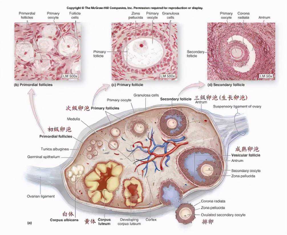 女性一生的卵子是有限且不可再生的,育龄期女性每月发育一批卵泡(即可被募集的卵泡),其中一般仅一枚优势卵泡可以发育成熟并排卵。