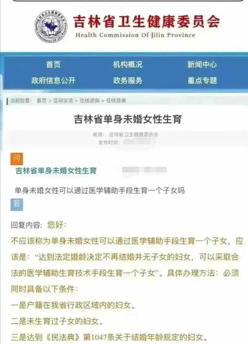 或许是出于对生育率的考虑,吉林省最近颁布了关于单身女性试管生子的相关权限。