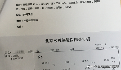 2019年11月18日王女士中药调理改善大半月后开始胚胎移植。移植后第9天血HCG检查数值54.无出血情况,偏见小腹痛,胡医生针对她的情况建议进一步中医保胎,并开具了一些中医药方。在2019年11月29日,移植后第11天,血hcg数值76.脾肾两虚,胡医生根据她的情况适时调整,开了补肾健脾安胎中药继续保胎。
