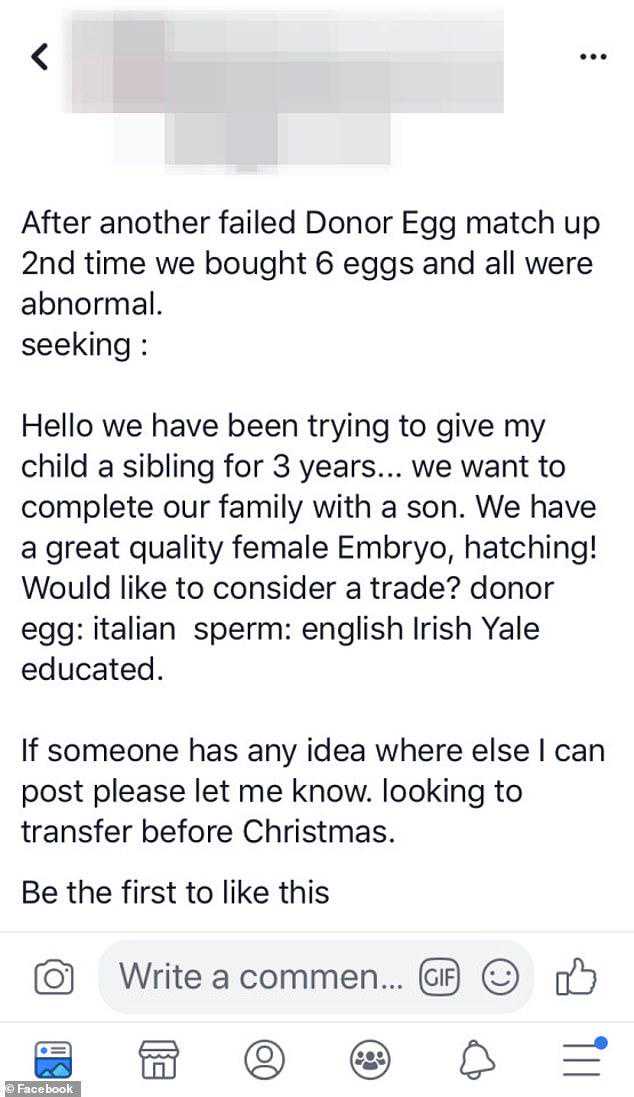 随即,丽莎和雷做出了一个大胆的决定,将他们的冷冻的女婴胚胎和拥有男婴胚胎的人进行交换,于是他们在Facebook上发表了一个匿名帖子,提出了他们的诉求。不过现在这条帖子已经被删除。