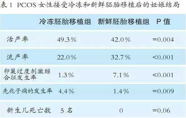 该研究为一项多中心临床试验,纳入1508例PCOS不孕女性,均处于第一个体外受精周期中。胚胎发育3d后,受试者随机分为两组,分别接受新鲜或冷冻的胚胎移植。