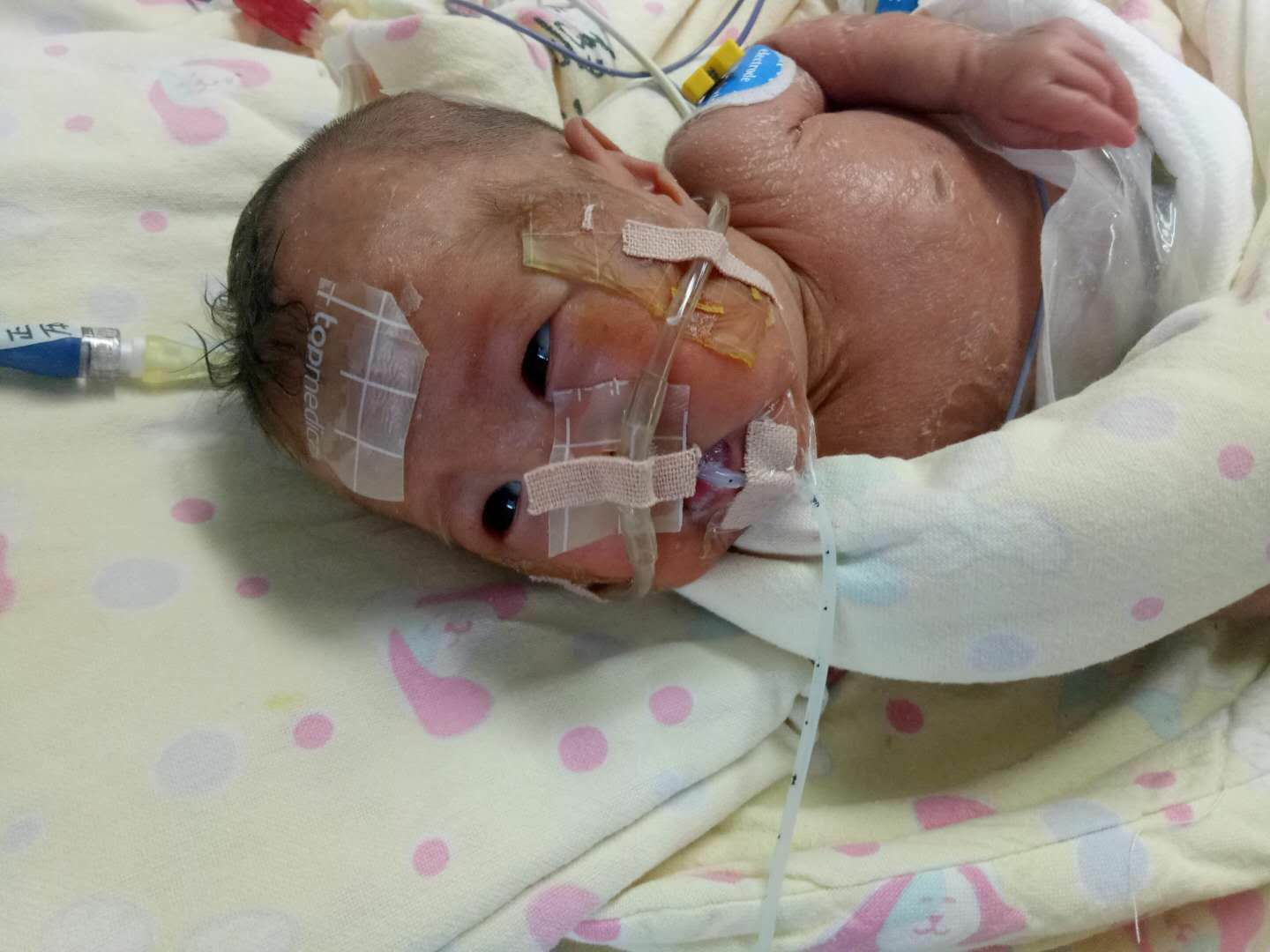 由于早产,我刚刚接受了手术切除了十几厘米的肠子,排泄还要靠接在体外的罩袋。过几天我还要再做手术把切断的肠子接回去。医生说我能不能活下来还要观察。这是我的弟弟,他还没有脱离呼吸机。由于早产,他的肺还发育不完全。医生说如果用药再过几周还不能自主呼吸,他这辈子就永远都不能离开呼吸机了。