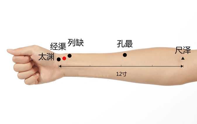 第二个穴位叫孔最穴。它是手太阴肺经的郄穴,这种郄穴往往是气血深聚的穴位,一般像久咳,甚至伴见咳血的这种咳嗽,可以选择这一穴位。