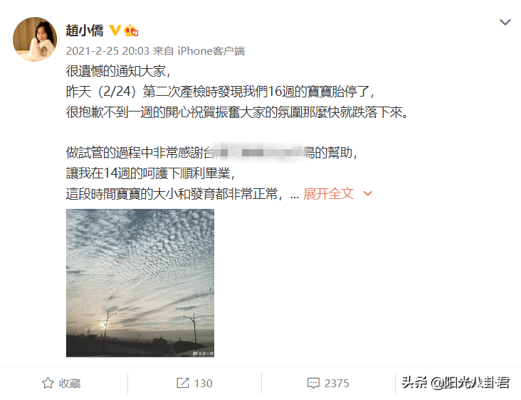 仅仅过去不到一周,赵小侨再次发文,她透露怀孕16周的宝宝胎停了,没有征兆,也没有任何挽留方法,一切都是如此突然。