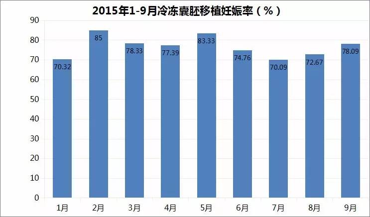2015年1-9月35岁以下新鲜胚胎移植妊娠率高达75%,35岁以下冷冻胚胎移植妊娠率高达74.36%,整体新鲜胚胎移植妊娠率高达69.44%,整体冷冻囊胚移植妊娠率高达85%,上千对夫妇迎来了“好孕”,让更多的不孕不育家庭看到了希望。