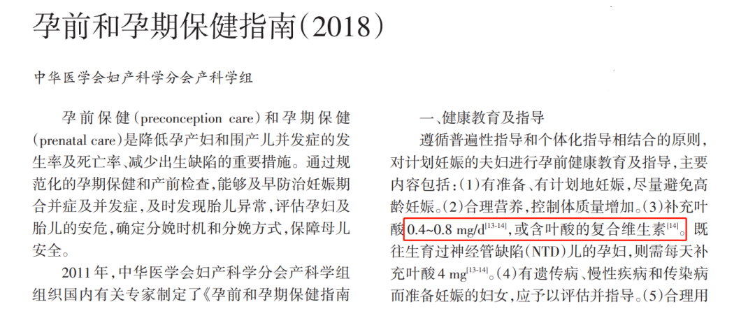 《孕前和孕期保健指南(2018)》中明确计划妊娠女性应该补充叶酸0.4~0.8mg/d,或含叶酸的复合维生素。