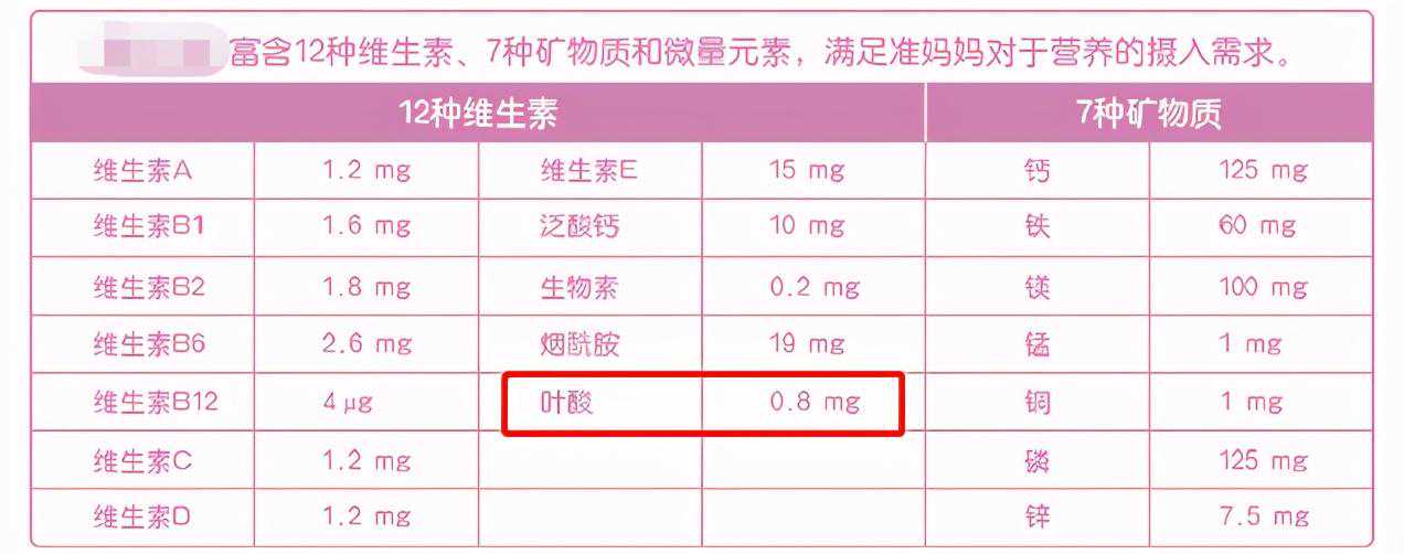 在购买时一定要注意观察成分表中叶酸的含量,尽量选择其中叶酸含量在0.4mg~0.8mg之间。